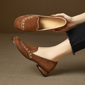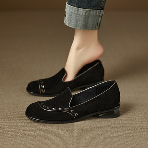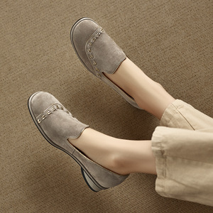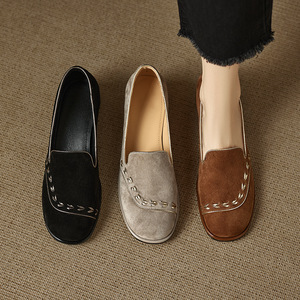 磨砂羊皮复古低跟一脚蹬乐福鞋女2025新款真皮圆头平底单鞋豆豆鞋