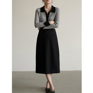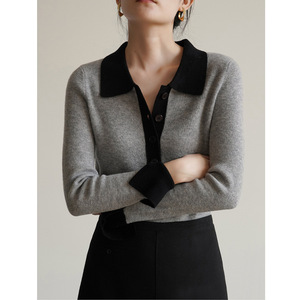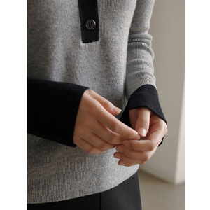 欧货撞色羊毛女翻领秋冬长袖灰色套头毛衣打底针织衫上衣