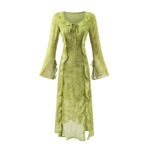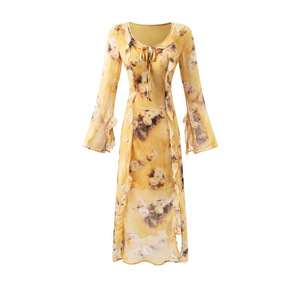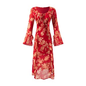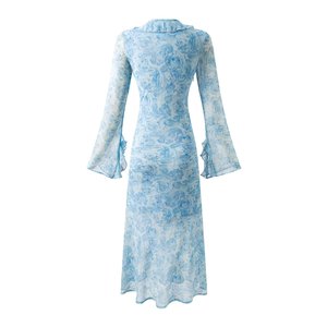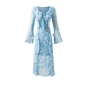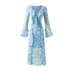 2025秋季新款女装法式复古气质修身荷叶边圆领长袖收腰印花连衣裙