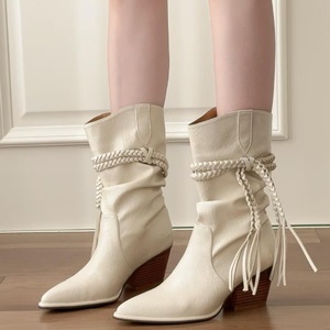 埃及靴~2025秋冬季复古流苏粗跟中筒靴西部牛仔靴女尖头堆堆短靴