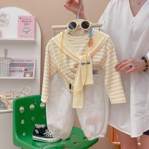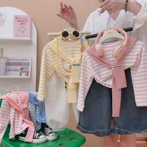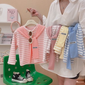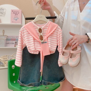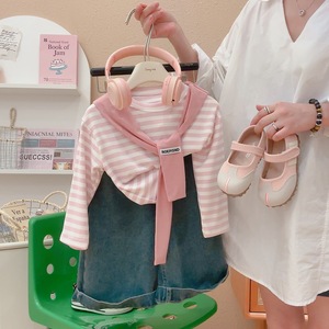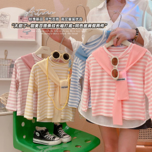 2025浅秋新款女宝学院风条纹假两件披肩上衣百搭长袖T恤
