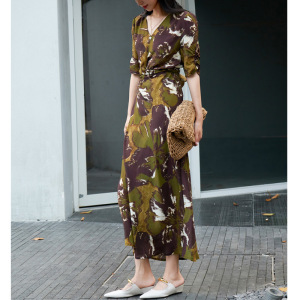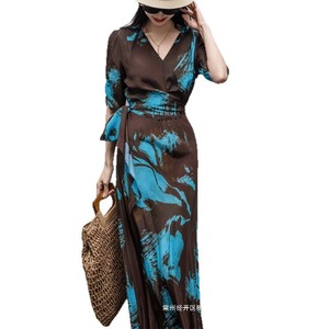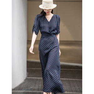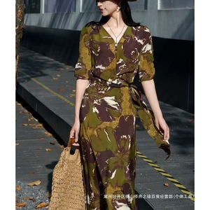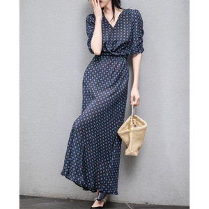 跨境25夏季新款法式复古碎花桑蚕丝连衣裙女收腰显瘦气质长裙子女