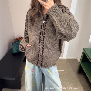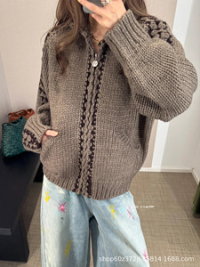 【现货发】 yy25秋冬新款设计粗针高级手工钩花拼接连帽针织外套