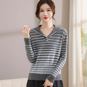 跨境妈妈装中年妈妈海军翻领针织衫春秋新款毛衣百搭新款长袖上衣