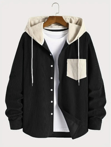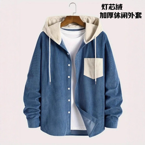 跨境爆款条纹撞色开衫衬衣男士纽扣灯芯绒外套男装连帽长袖衬衫