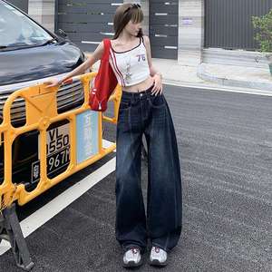 批发美式复古刺绣弯刀阔腿牛仔裤女高腰直筒宽松拖地裤代发