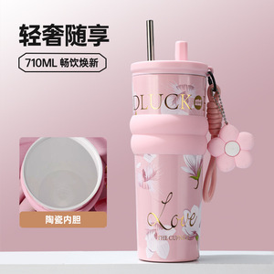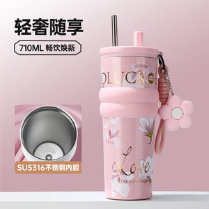 新款繁花保冷保温杯大容量男不锈钢吸管杯车载女办公室冰霸水杯子