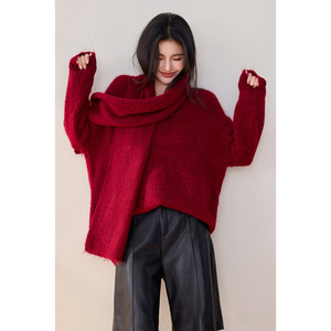 慵懒风套头V领羊毛厚毛衣披肩新年围巾两件套装女