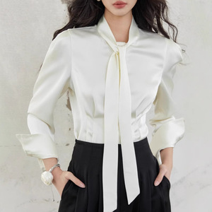 WANGO重磅奢贵高级双面缎光泽华丽一体式飘带领收腰长袖衬衫女