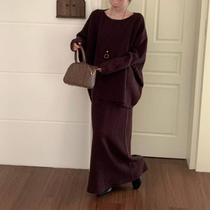 欧美女装跨境货源秋冬搭配一整套慵懒风毛衣+针织半身裙两件套装