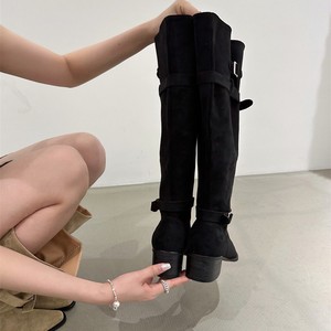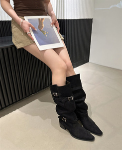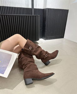 慵懒风皮带扣堆堆靴2025秋冬尖头粗中跟绒面宽松大筒高筒围长靴女