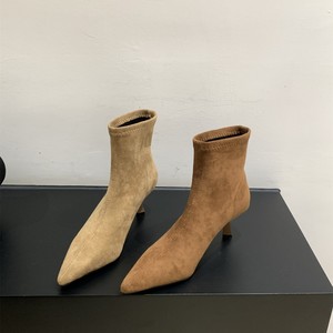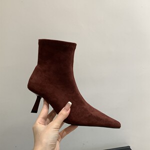 卡其色绒面高跟瘦瘦靴女鞋2025春秋季单靴配裙子尖头法式小短靴子