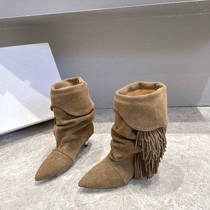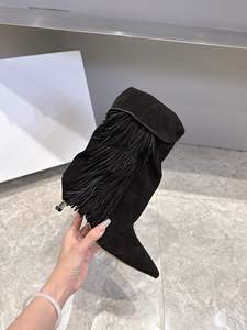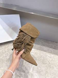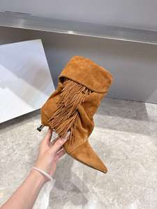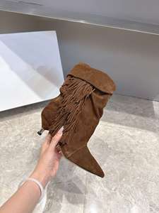 高定新款复古牛翻皮尖头流苏中筒西部靴棕色短靴女秋冬时尚单靴