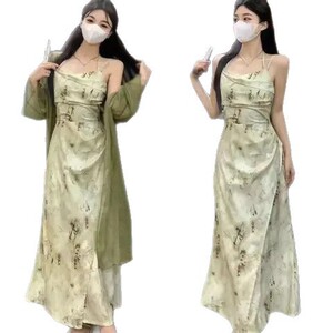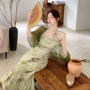 新中式国风复古吊带连衣裙女夏季开衫收腰显廋碎花气质长裙两件套