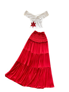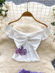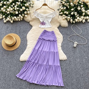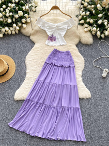 法式风扭结印花一字肩短款上衣松紧腰木耳边大摆长裙御姐套装女夏
