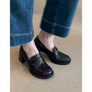 羊皮版~山茶花黑色高跟鞋厚底真皮复古乐福鞋女一脚蹬懒人小皮鞋