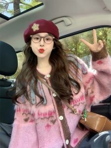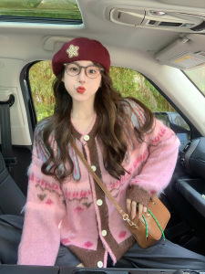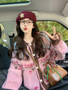 粉色费尔岛提花毛衣外套女秋冬厚2025新款慵懒温柔风复古针织开衫