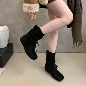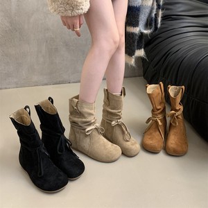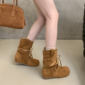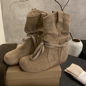 复古内增高短靴女2025秋冬新款圆头系带厚底马丁靴勃肯西部牛仔靴