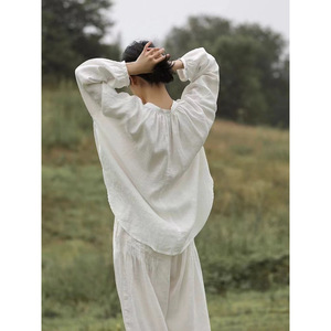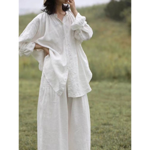 现货高级感白色棉麻衬衫套装女初秋休闲宽松慵懒风亚麻衬衣两件套