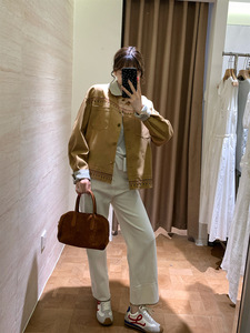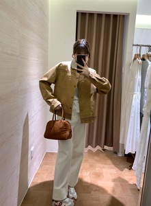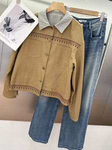 暖九夏 红人店同款!民族风刺绣条纹翻领休闲棕色短款工装外套