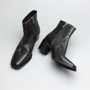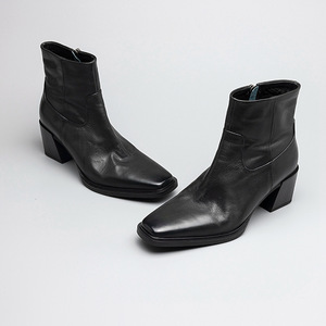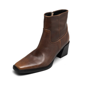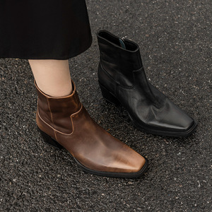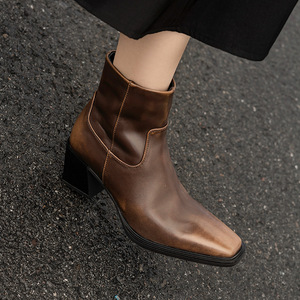 擦色牛皮粗跟短靴女2025秋冬新款女靴简约时尚高跟靴欧美风皮靴