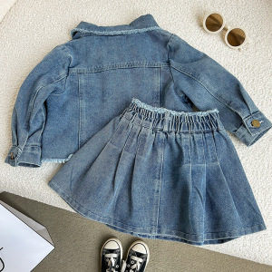 蓝色复古翻领长袖牛仔外套褶皱半身裙套装时尚洋气两件套TQ233