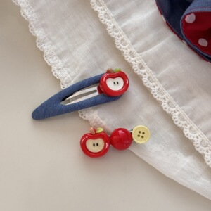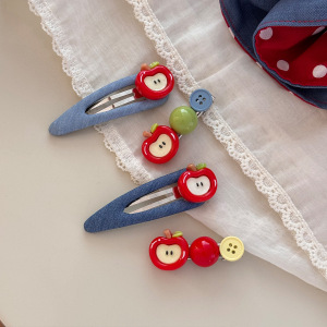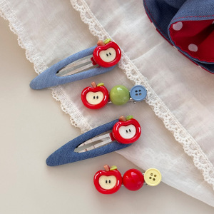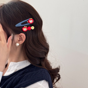 深蓝牛仔布艺红苹果蝴蝶结发夹可爱边夹刘海夹BB夹鸭嘴夹新款发饰