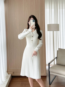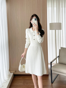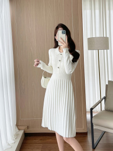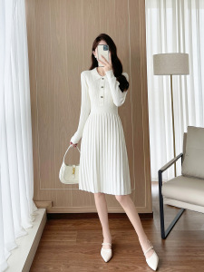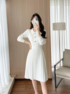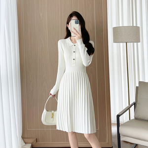 秋季法式白色针织A字裙收腰显瘦针织连衣裙名媛气质小香风毛衣裙
