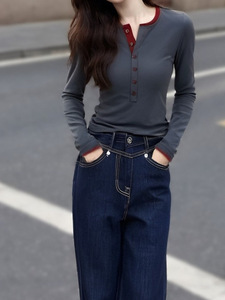 早秋季长袖打底衫圆领撞色排扣显瘦洋气新款上衣修身气质百搭T恤