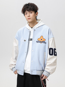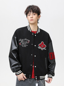 杰克传洋男装美式棒球服刺绣撞色PU飞行夹克外套男女春秋情侣休闲