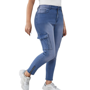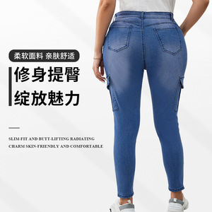 跨境欧美潮流大码牛仔裤女款工装风弹力拉链小脚裤牛仔裤现货批发