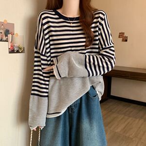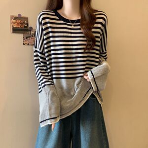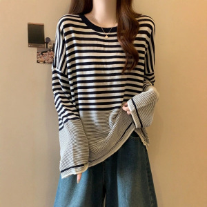 韩版宽松慵懒条纹套头针织衫秋季大码胖mm时尚显瘦毛衣长袖上衣潮