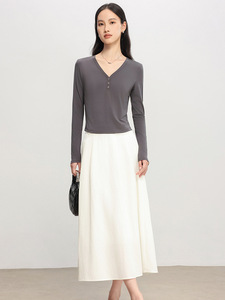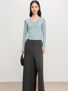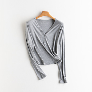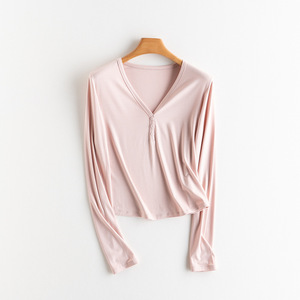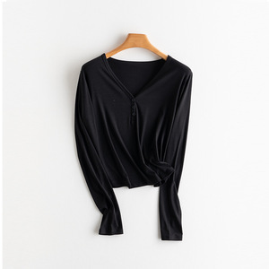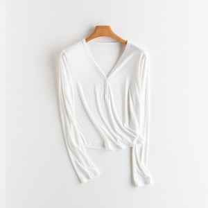 初秋上新女装裸感蚕丝合体V领长袖T恤打底松弛感慵懒午逅氧气罩衫