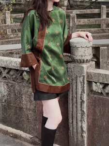 人丝香云纱撞色提花复古中式圆领斜襟盘扣精致绿色贵气秋季上衣