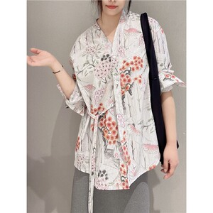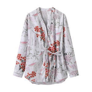 现货25秋季新中式花朵印花V领系带衬衫女宽松显瘦百搭长袖上衣女
