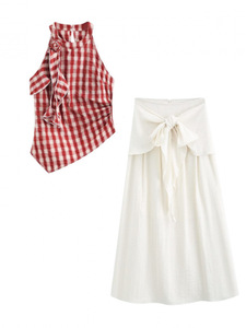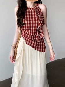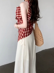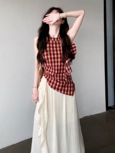 连衣裙女夏季2025新款设计感小众不规则格纹无袖背心长裙子两件套