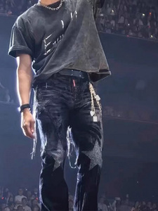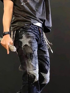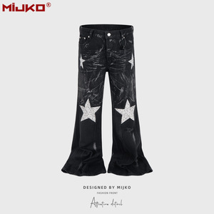 MIJKO男装女烫五角星钻微喇牛仔裤男女同款阔脚做旧朋克黑色长裤