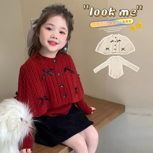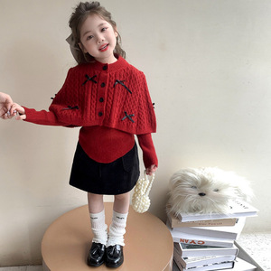 女童套装假两件蝴蝶结毛衣套头衫2025秋冬拜过新年服宝宝红色套装