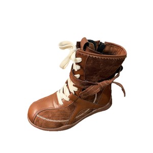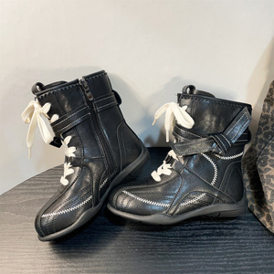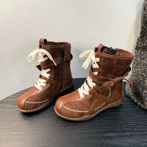 2025秋季蝴蝶结绑带女童复古中筒靴英伦风拼皮儿童骑士靴新款皮靴