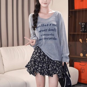 新品亚马逊欧美灰色字母印花长袖防晒罩衫夏季宽松慵懒风t恤上衣
