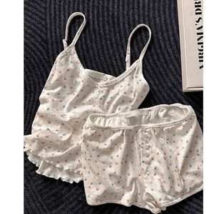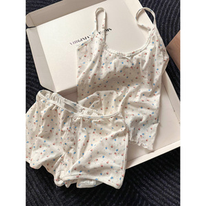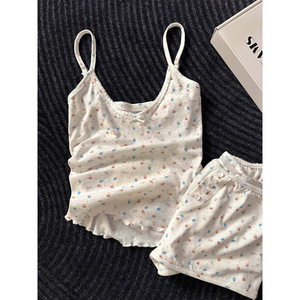 甜美少女小碎花吊带短裤睡衣女夏季蕾丝花边拼接大码家居服套装潮