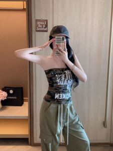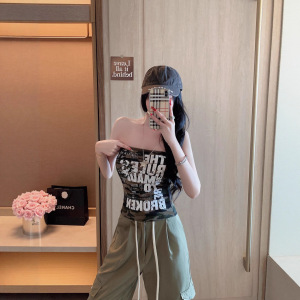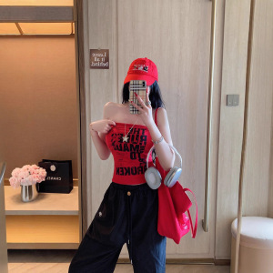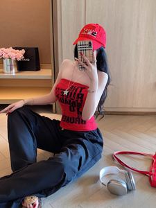 美式复古字母印花辣妹红色抹胸背心女夏季短显瘦带胸垫外穿上衣