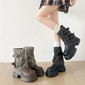 黑色厚底增高套筒短靴女款2025年秋季时尚百搭设计感皮带扣马丁靴