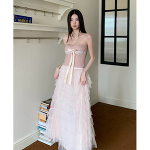 粉色甜美网纱蛋糕裙夏季高腰长款半身裙+吊带女波点鱼骨抹胸上衣