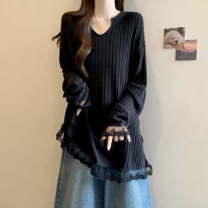 大码慵懒风蕾丝下摆V领长袖上衣女春季2025新款宽松时尚打底衫女