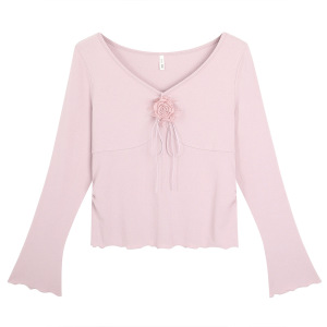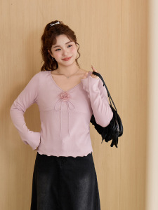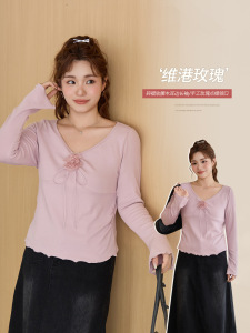 韩系正肩玫瑰V领木耳边长袖针织小衫女秋季新款胖mm大码T恤65467
