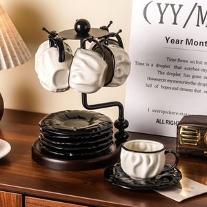 圆形带串珠杯架-相思木褶皱6杯6碟(3咖色3黑色)