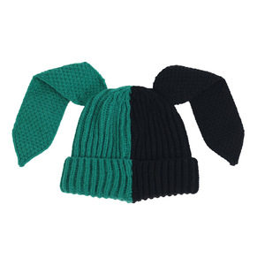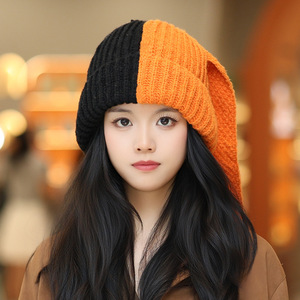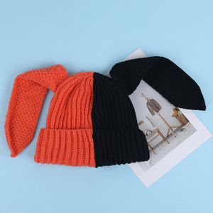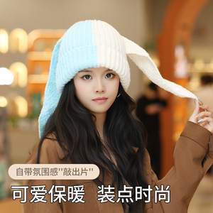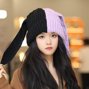 2025新款跨境拼色针织长兔耳朵帽子女秋冬季可爱大头围撞色毛线帽