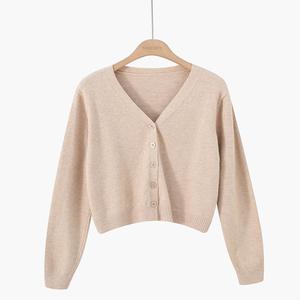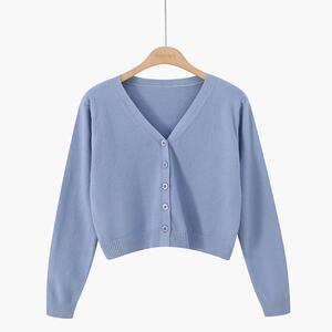宽松春秋小短款高腰长袖女上衣毛衣短小外套v领针织衫开衫小外搭