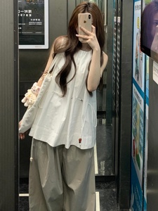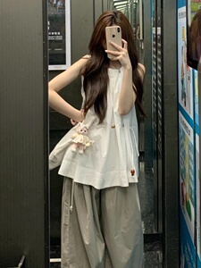 设计感小众休闲运动套装女夏季无袖抽绳上衣薄款工装阔腿裤两件套